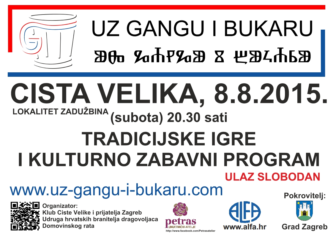 Već devetu godinu za redom Klub Ciste Velike i prijatelja ostvaruje izuzetno uspješnu suradnju sa UHBDDR-a na festivalu „ Spoj hrvatskog sjevera i juga – Uz gangu i bukaru“ koji se održava u Cisti Velikoj, 7. i 8. kolovoza 2015.