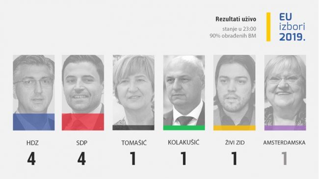 Prema prvim neslužbenim rezultatima izbora za Europski parlament, koje je u nedjelju u 23 sata objavilo Državno izborno povjerenstvo (DIP), HDZ je osvojio 5 mandata, SDP 3, a Hrvatski suverenisti, Mislav Kolakušić, Živi zid i Amsterdamska koalicija po jedan mandat .