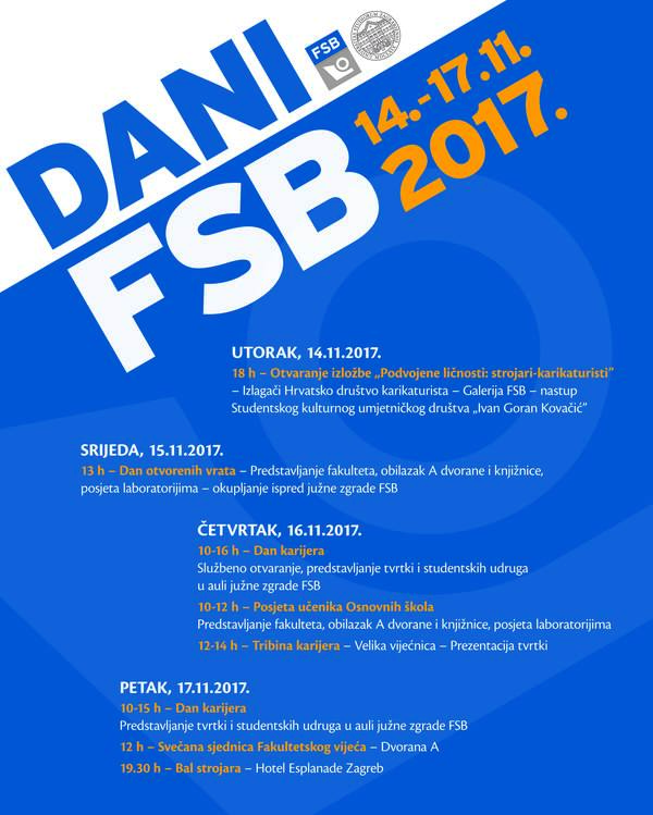 Dani FSB-a se održavaju od utorka 14. studenoga do petka 17. studenoga, a obuhvaćaju izložbu „Podvojene ličnosti: strojari-karikaturisti“ kada će biti i službeno otvaranje manifestacije Dana fakulteta, Dane karijera i Tribinu karijera na kojima će se prezentirati različite tvrtke te studentske udruge sa svojim projektima, Dan otvorenih vrata u sklopu kojeg je organiziran obilazak fakultetskih laboratorija, Bal strojara i Svečanu sjednicu.