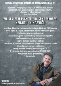 U srijedu, 8. listopada 2025., u 11 sati, u dvorani Specijalne policije iz Domovinskog rata RH, u Zagrebu, Trg žrtava fašizma 1, bit će iznimno svečano, jer će Udruga hrvatskih branitelja Domovinskog rata91., u suradnji s drugim Udrugama proizašlim iz Domovinskog rata, dodijeliti Nenadu Ninčeviću, splitskom skladatelju i tekstopiscu, tradicionalno braniteljsko priznanje – „Veliku zlatnu plaketu-Da se ne zaboravi“. Naime, ova udruga ne zaboravlja one koji su dali doprinos tijekom stvaranja hrvatske države, a među kojima su bili i glazbenici.