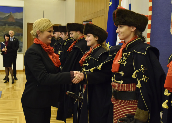 Predsjednica Republike Hrvatske Kolinda Grabar-Kitarović primila je u petak 17. studenoga na Pantovčaku izaslanstvo ustanove Academia Cravatica i Počasne satnije Kravat pukovnije.