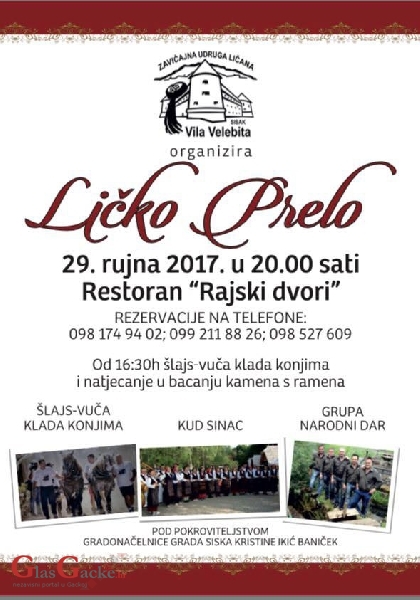 Cijena ulaznica i konzumacije za ličko večernje druženje, uz sastav „Narodni dar“ i članove HKUD-a „Sinac“, u „Rajskim dvorima“ je 120 kuna. Sve informacije i predbilježbe zainteresiranih mogu se obaviti na mobitelski broj 098/1749-402. (J.F.) T