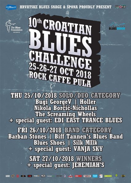 Jubilarno, deseto natjecanje domaćih blues glazbenika, 10th Croatian Blues Challenge, održat će se od 25. do 27. listopada u pulskom Rock Caffeu. Ovo je već treći put da Pula ugošćuje Croatian Blues Challenge te još jednom na tri dana postaje epicentar hrvatskog bluesa.