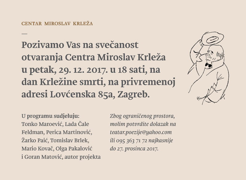 U petak 29. prosinca najavljeno je otvaranje Centra Miroslav Krleža na dan obilježavanja 36. godišnjice Krležine smrti, u Lovćenskoj ulici 85 A. U programu sudjeluju: Tonko Maroević, Lada Čale Feldman, Perica Martinović, Žarko Paić, Tomislav Brlek, Mario Kovač, Olga Pakalović i autor projekta Goran Matović.
