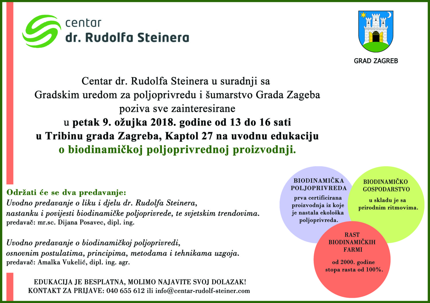 U petak 9. ožujka u Tribini grada Zagreba, na Kaptolu 27, od 13 do 16 sati, u organizaciji Centra dr. Rudolfa Steinera održava se predavanje o biodinamičkoj poljoprivredi.