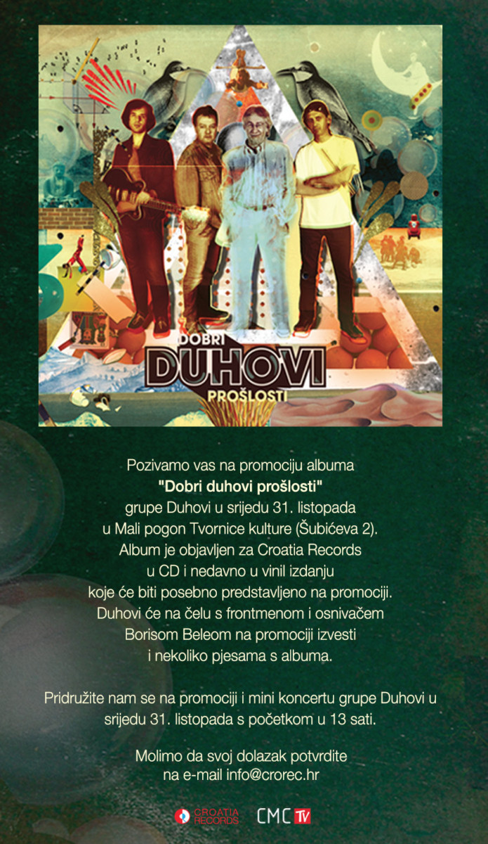 U srijedu 31. listopada u Malom pogonu Tvornice kulture održat će se predstavljanje albuma grupe “Duhovi” u izdanju Croatia recordsa. Početak je u 13 sati.