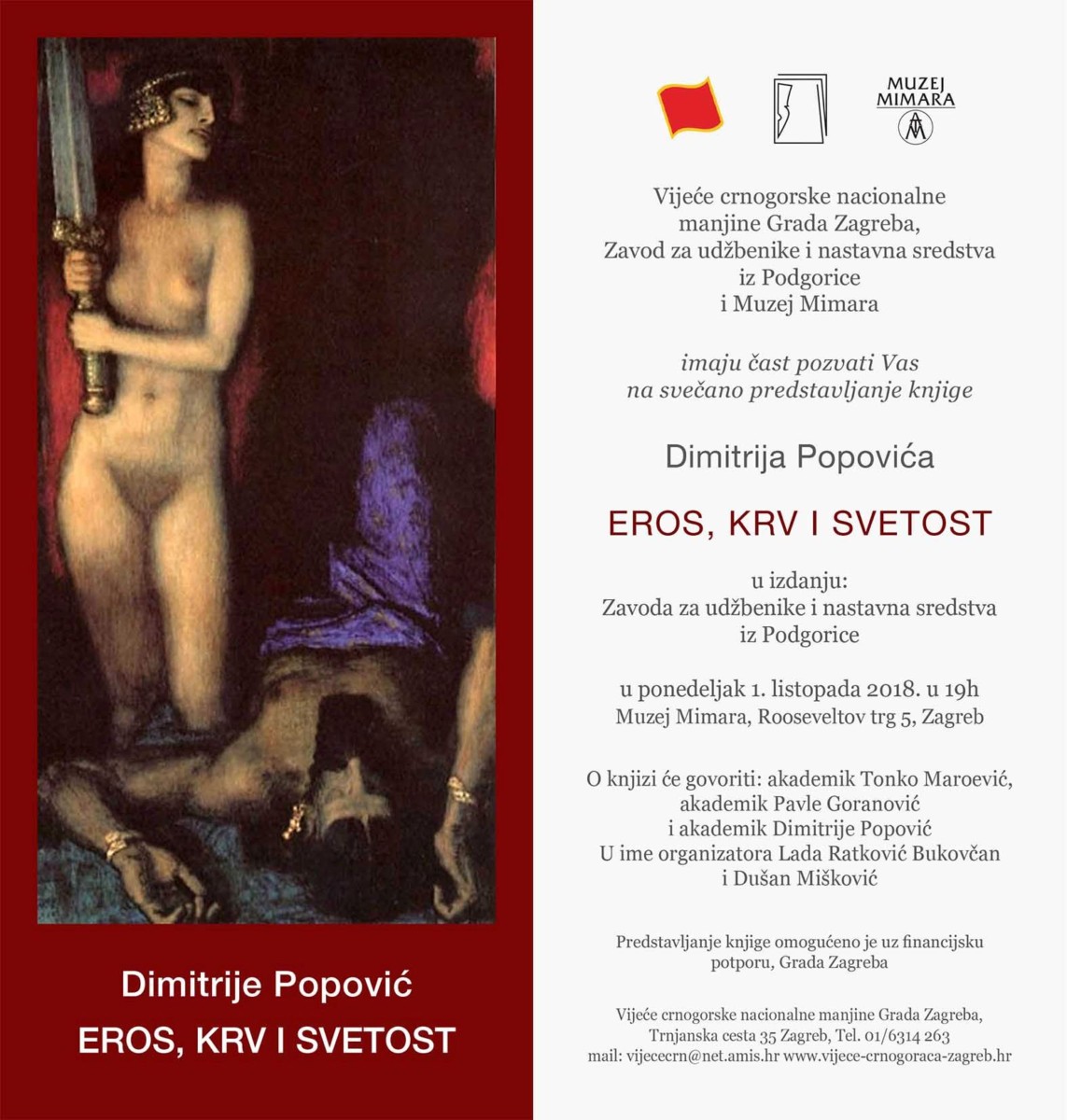 Prestavljanje knjige Dimitrija Popovića “Eros, krv i svetost” u izdanju Zavoda za udžbenike i nastavna sredstva iz Podgorice, održat će se u zagrebačkom Muzeju Mimara, Roozveltov trg 5, u ponedjeljak 1. listopada od 19 sati.