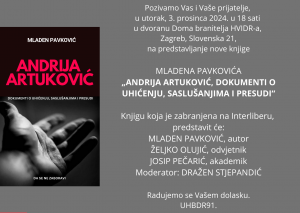 Knjigu „Andrija Artuković, uhićenje, suđenje i presuda“ (Vlastita naklada, Koprivnica, 2024.) uz autora Mladena Pavkovića knjigu predstavit će akademik Josip Pečarić, odvjetnik Željko Olujić i kao mederator Dražen Stjepandić. T