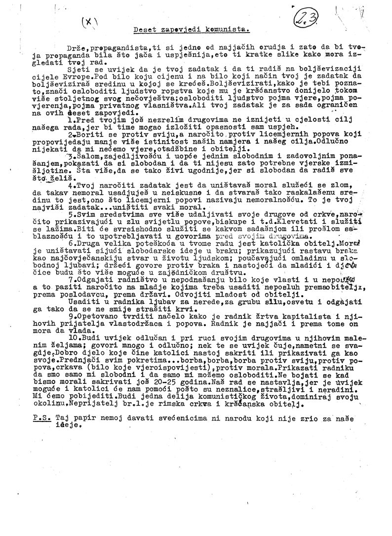 10. Budi uvijek odlučan i pri ruci svojim drugovima u njihovim malenim željama; govori mnogo i odlučno; nek te se uvijek Čuje, nametni se svagdje. Dobro djelo koje čine katolici nastoj sakriti ili prikazivati ga kao svoje. Prednjači svim pokretima…borba, borba, borba protiv sviju, protiv popova, crkava (bilo koje vjeroispovijesti), protiv morala. Prikazati radniku da smo samo mi slobodni i da samo mi možemo osloboditi. Ne bojati se kad bismo morali sakrivati još 20-25 godina. Naš rad se nastavlja, jer je u vijek moguće i katolici će nam pomoći pošto su neznalice, strašijivi i neradini. Mi ćemo pobijediti. Budi jedna delija komunističkog života, dominiraj svoju okolinu, Neprijatelj br.l.je rimska crkva i kršćanska obitelj.