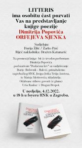 U nedjelju 4. prosinca, od 20 sati Dimitrije Popović će u foyeru HNK predstaviti svoju novu knjigu „Orfejeva sjenka“ u izdanju Litterisa iz Zagreba.