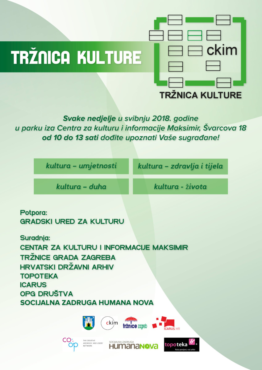 Svake nedjelje u svibnju, od 10 do 13 sati, Švarcova 18. Uz potporu Gradskog ureda za kulturu, u suradnji s Tržnicama grada Zagreba, Hrvatskim Državnim Arhivom, Topothek-om i Icarusom, udrugom Humana Nova, OPG društvima iz raznih krajeva Hrvatske te hrvatskim glazbenim izdavačkim kućama, Centar za kulturu i informacije Maksimir, napravit će tržnicu kulture – umjetnosti (mladi i nepoznati bendovi imat će priliku svirati da ih stvarno čuju izdavači); kulture – zdravlja i tijela (Tržnica grbavog povrća – fino, zdravo BIO ili EKO povrće, začini i sadnice); kulture – duha (pokrećemo Topotheku Maksimir – skupljaju se uspomene, stare slike, filmovi, predmeti, koji se fotografiraju i/ili skeniraju te se vraćaju vlasnicima, a fotografije se spremaju na Topothek Portal, koji se automatski veže i za Europeanu (EU projekt); kulture – života (Humana Nova prikupljat će odjevne predmete koje više ne trebate te ih reciklirati, a građani će moći i zamijeniti stvari koje više ne trebaju ili ih ostaviti za potrebite, a što je najvažnije, upoznat ćemo se. T