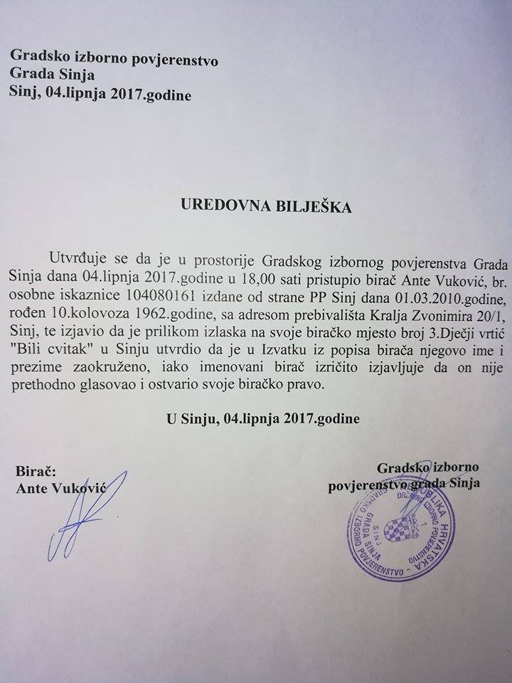Pošto je oduzeto biračko pravo Anti Vukoviću iz Sinja uz obrazloženje da je već glasao, dokazuje da je netko od Izbornog povjerenstva u Dječjem vrtiću – Bili cvitak zaokružio njegovo ime i glasao u njegovo ime.