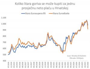 Ako se promatra razdoblje od 2014. do danas, vidi se jasan pomak. Tada se za prosječnu neto plaću u Hrvatskoj moglo kupiti oko 500 do 550 litara goriva. Danas se za istu prosječnu plaću može kupiti oko 975 litara Eurosupera 95 te oko 915 litara Eurodizela.